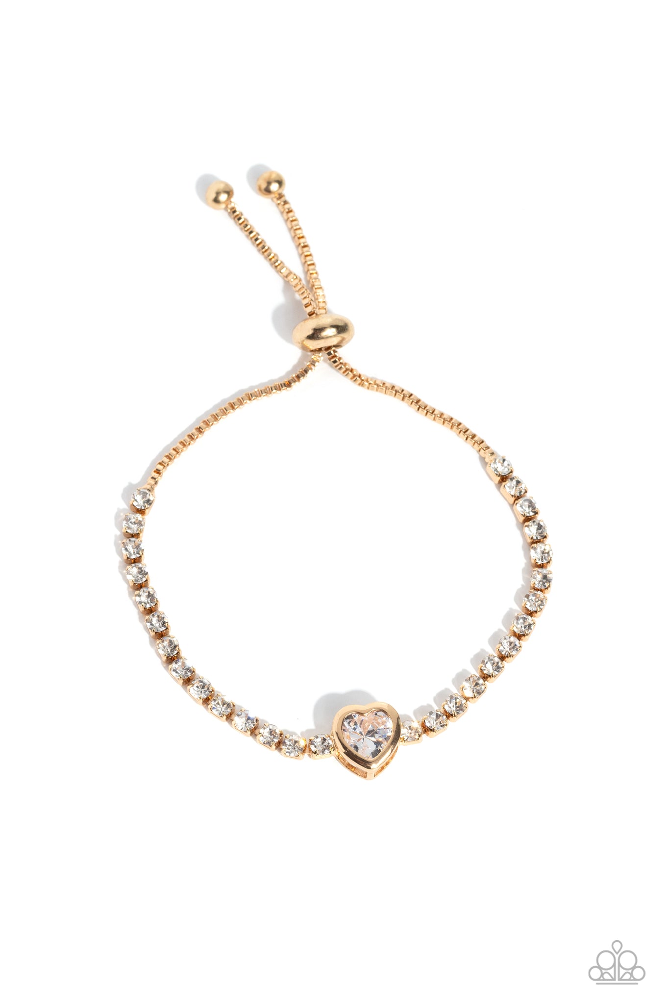 A strand of tiny white rhinestones, encased in gold, square fittings, leads to a white, heart-shaped gem wrapped in a sleek, three-dimensional, gold frame. The glittery display connects to a dainty gold box chain with gold beads on each end, wrapping around the wrist in a romantic finish. Features an adjustable sliding bead closure.