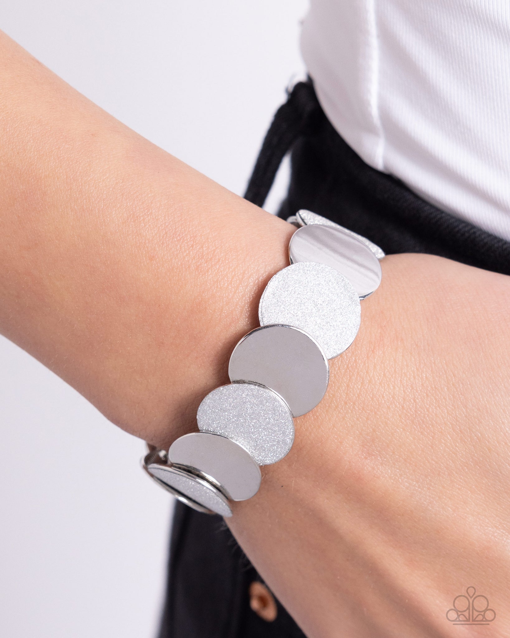A glimmering collection of shiny silver discs and glitter coated silver discs delicately overlap along stretchy bands around the wrist, creating a dazzling hint of shimmer.