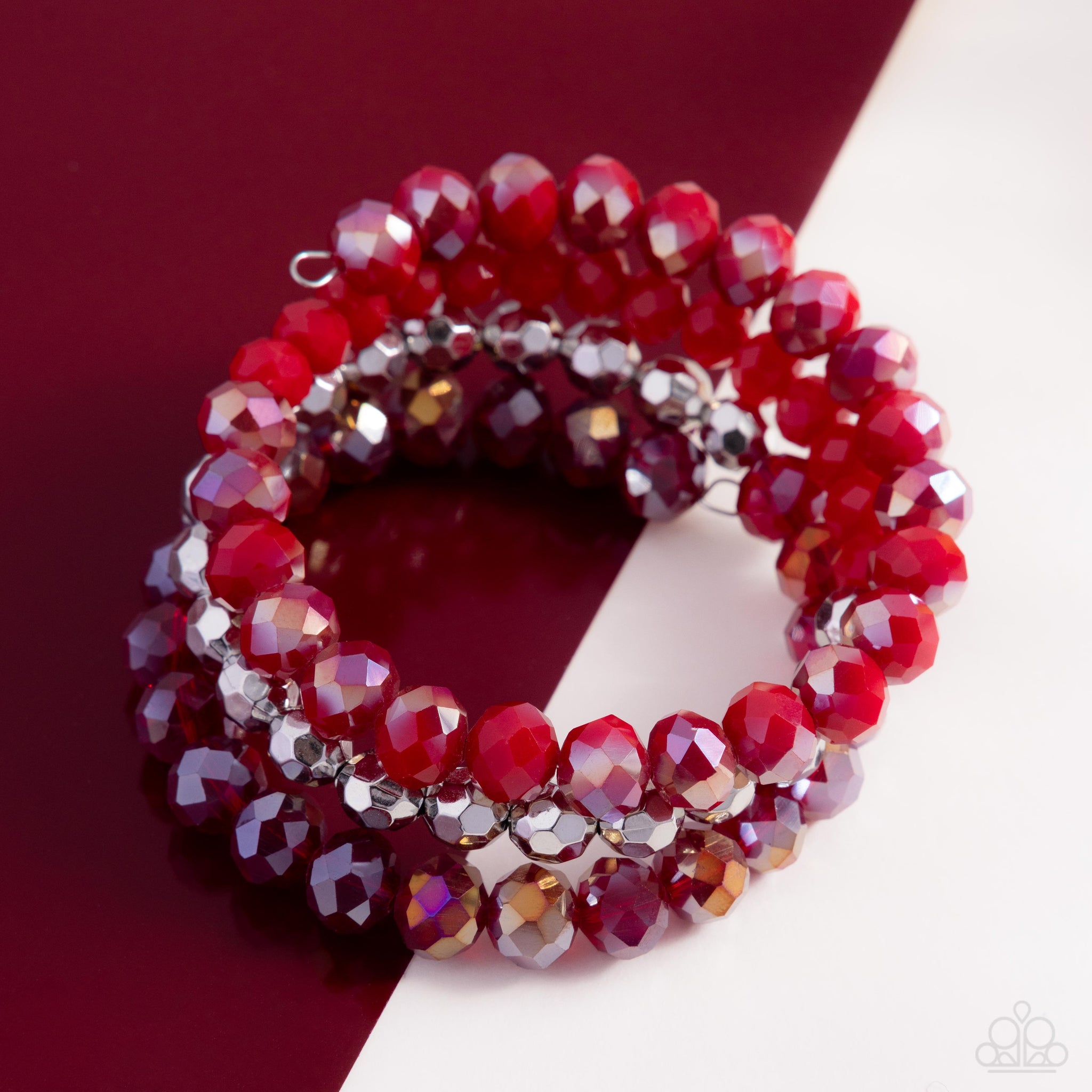 Featuring a faceted finish, a collection of textured silver beads, red multicolored beads, some with a shimmery overlay, and transparent red UV-splashed beads are threaded along a coiled wire, creating a refined pop of color infinity wrap-style bracelet around the wrist.