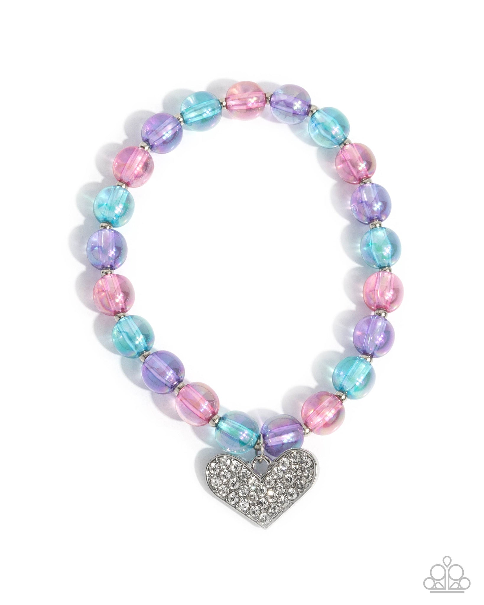 Featuring an iridescent finish, a collection of transparent purple, blue, and Pink Peacock beads are infused along an elastic stretchy band, alternating with silver beads for a colorfully chic pattern. A white rhinestone-dusted silver heart pendant swings from the display for a heartfelt finish.