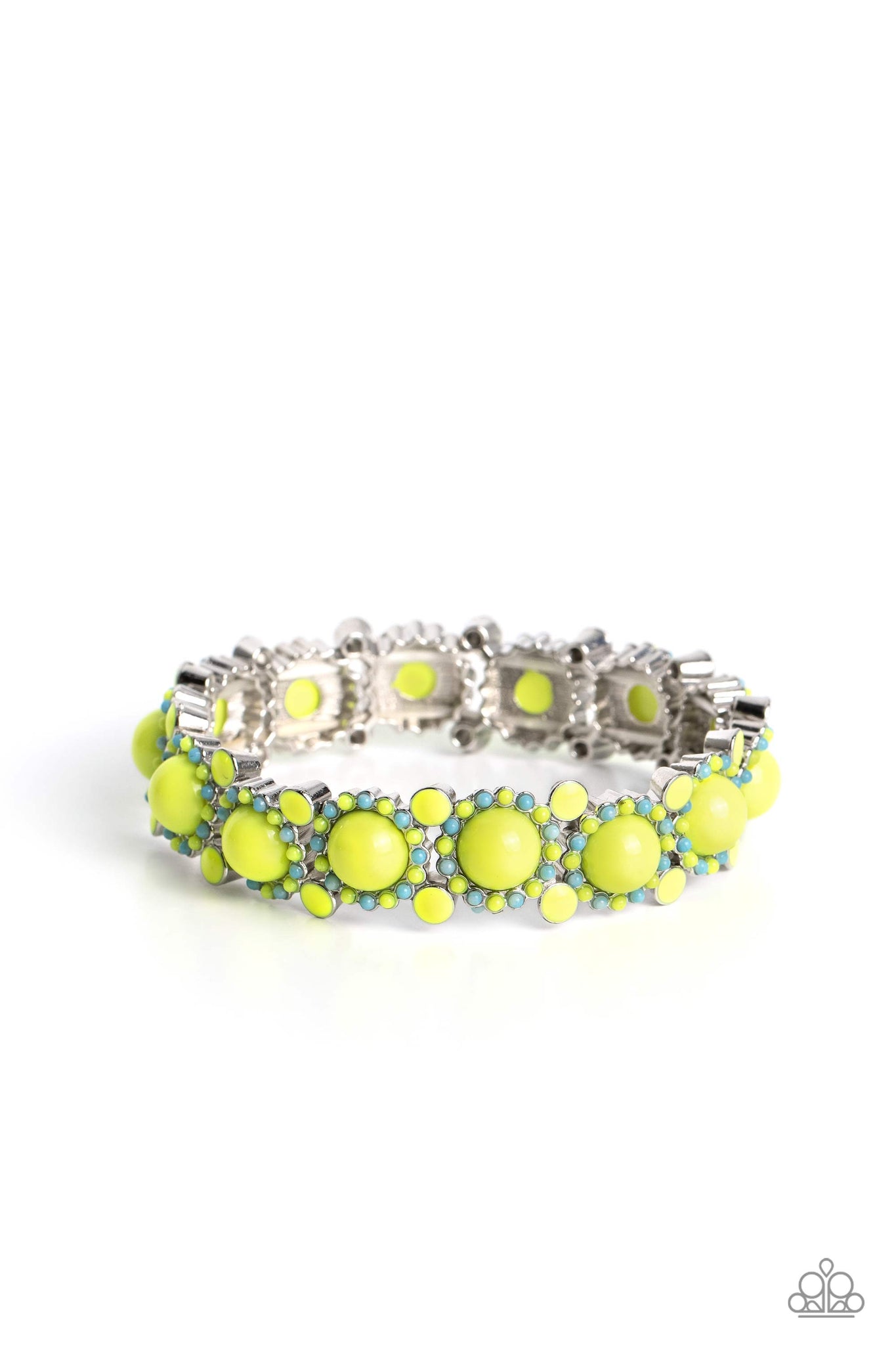Dotted in glossy Love Bird beaded centers, turquoise and Love Bird beaded silver floral frames delicately link around the wrist on stretchy bands for a whimsical arrangement. Separating each floral display, additional Love Bird beads pressed in thick scalloped fittings continue the bright cheerful motif.