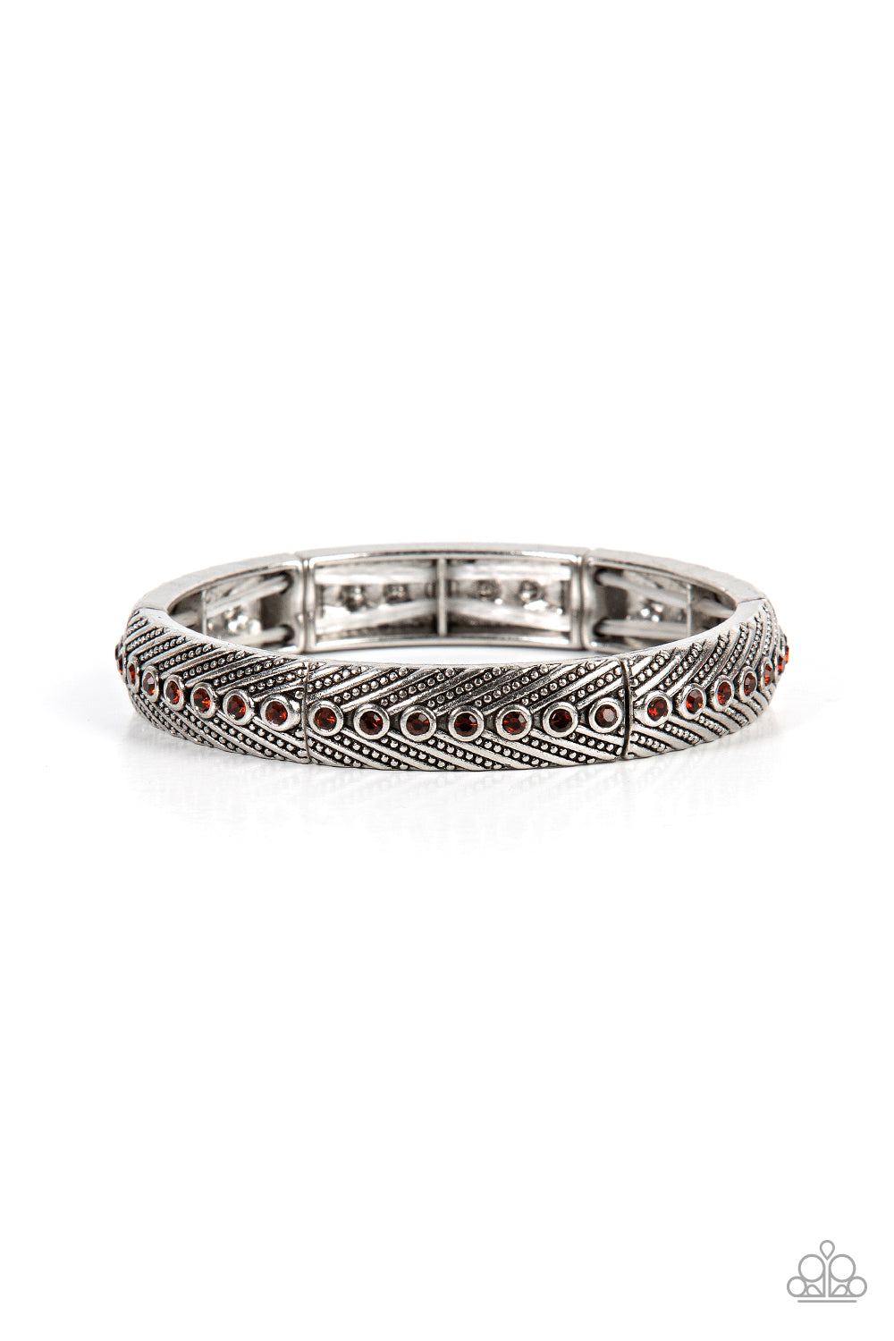 Dotted in a slanted geometric motif, topaz rhinestone encrusted silver frames are threaded along stretchy bands around the wrist for an edgy shimmer.