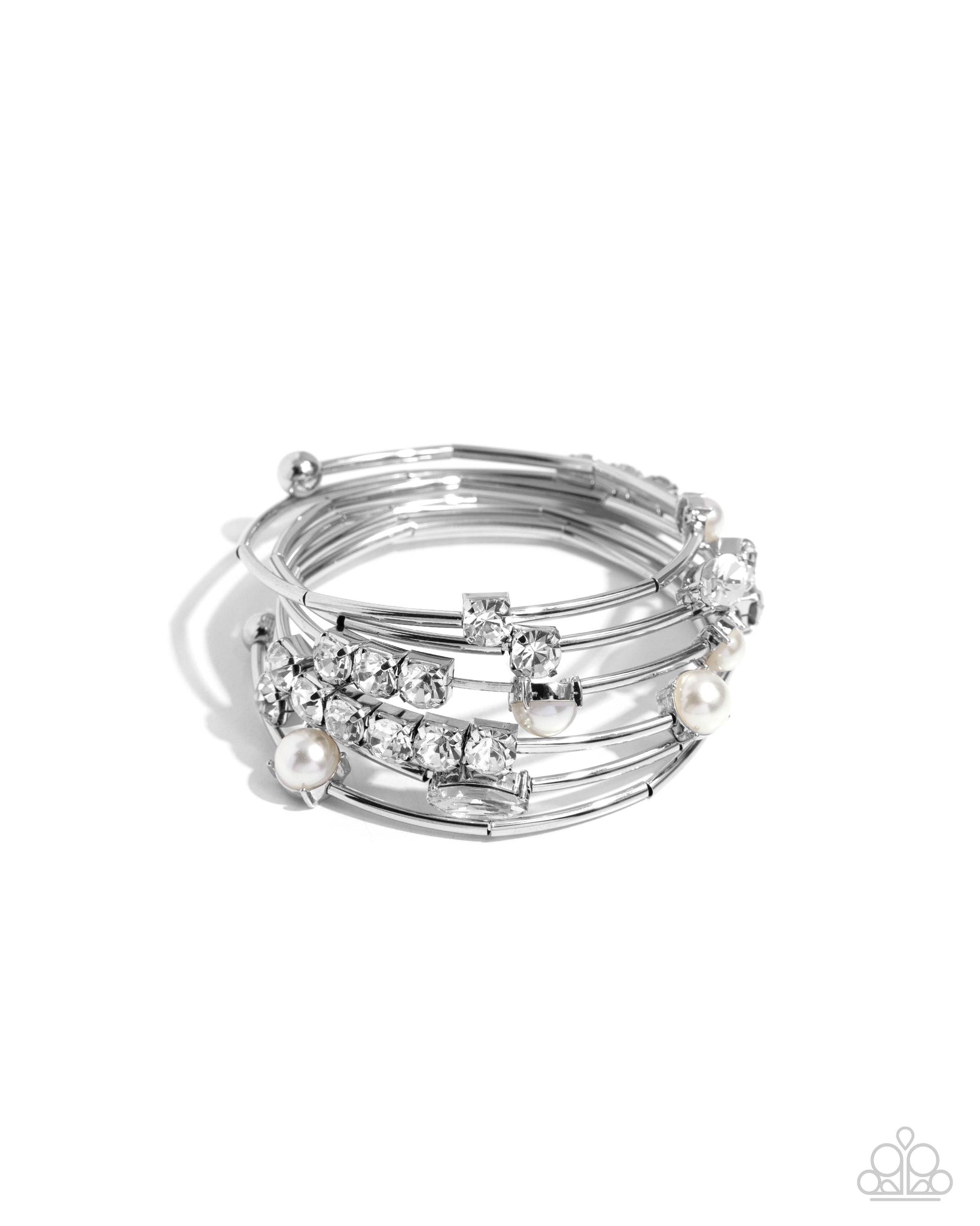 Threaded along a wire that coils along the wrist, glistening silver bars are sporadically interrupted by silver square-pronged white gems and white pearls to create an airy, bold infinity wrap-style bracelet.