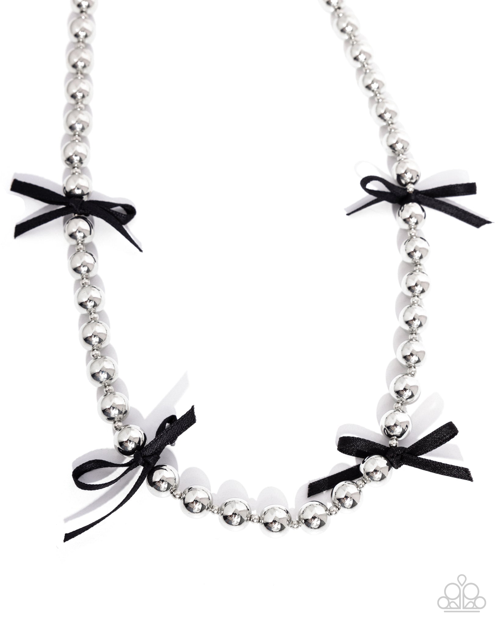 Infused with dainty silver studs, a bubbly collection of oversized silver beads cascades below the chest for a timeless display. A quartet of black ribbons sporadically interrupt the beaded display and are tied below the collar for a refined finish. Features an adjustable clasp closure.