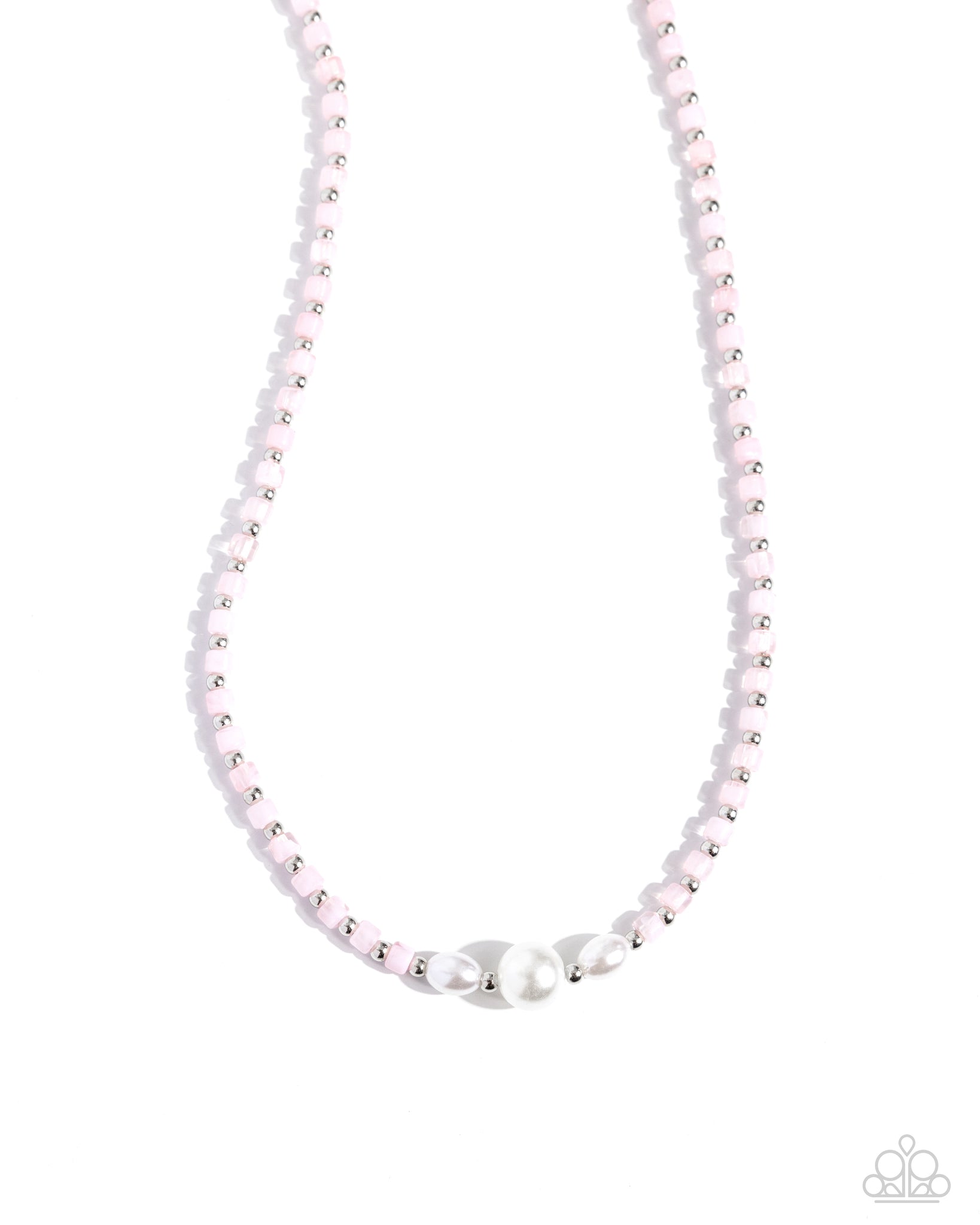 Infused along an invisible string, a collection of light pink beads alternates with silver beads along the neckline. Two oval white pearls and a larger round white pearl is infused along the center of the design for a touch of refinement. Features an adjustable clasp closure.