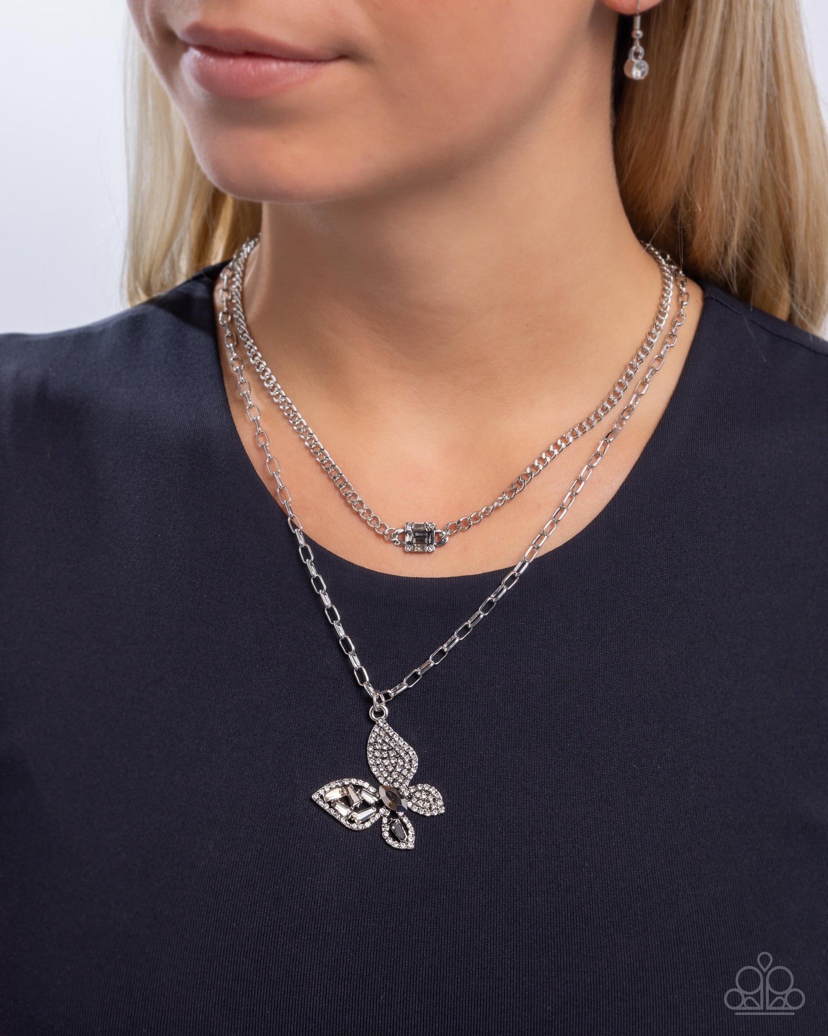 Two strands of varying silver chains drape along the neck. The shorter chain is accented with a pendant made up of hematite, white, and smoky emerald-cut rhinestones, while the longer chain features a butterfly pendant encrusted with white, hematite, and smoky rhinestones. The butterfly pendant strikes a balance between bold and intricate, making it a standout piece. Features an adjustable clasp closure.