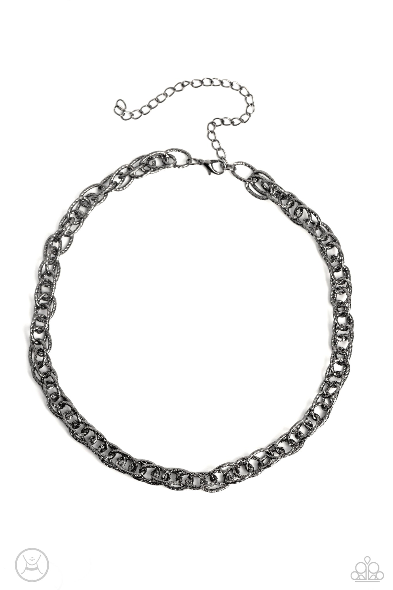 A strand of textured double gunmetal links drapes down the neckline in a stunning industrial display. The textured links catch and reflect the light at every angle, adding breathtaking shimmer to the monochromatic design. Features an adjustable clasp closure.