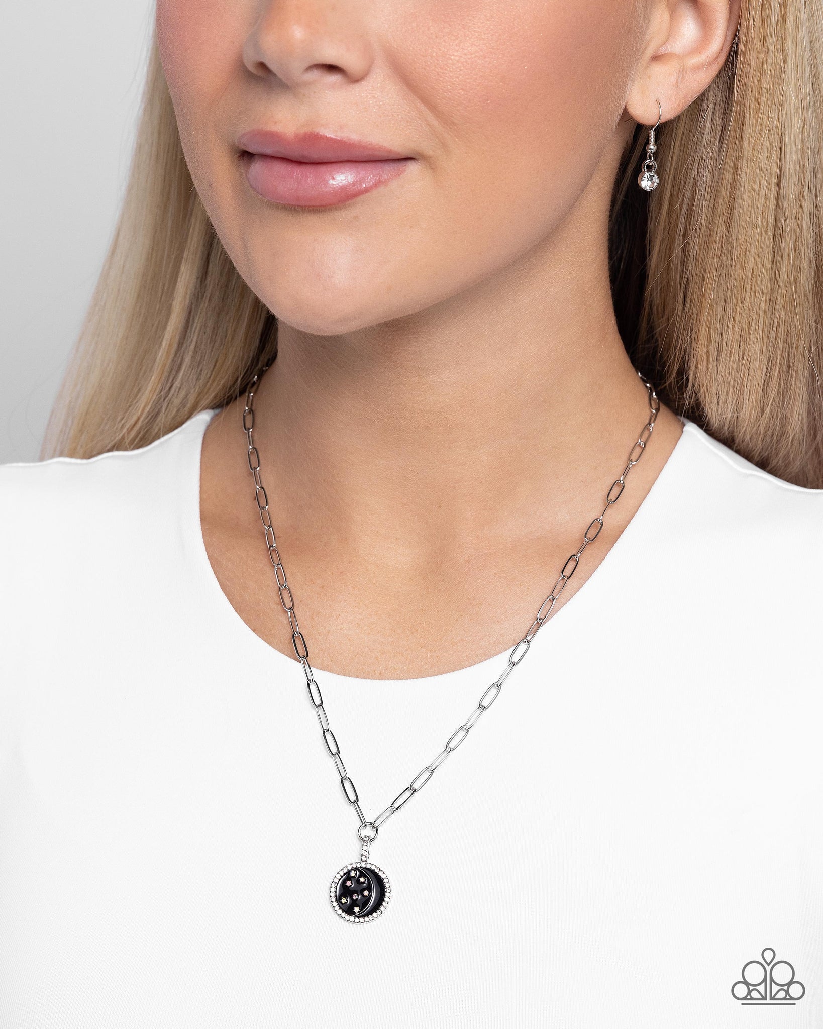 Featuring iridescent stars, a black-painted disc with a silver crescent moon outline and a border of white rhinestones twinkles from a silver paperclip chain for a celestial statement. Features an adjustable clasp closure. Due to its prismatic palette, color may vary.