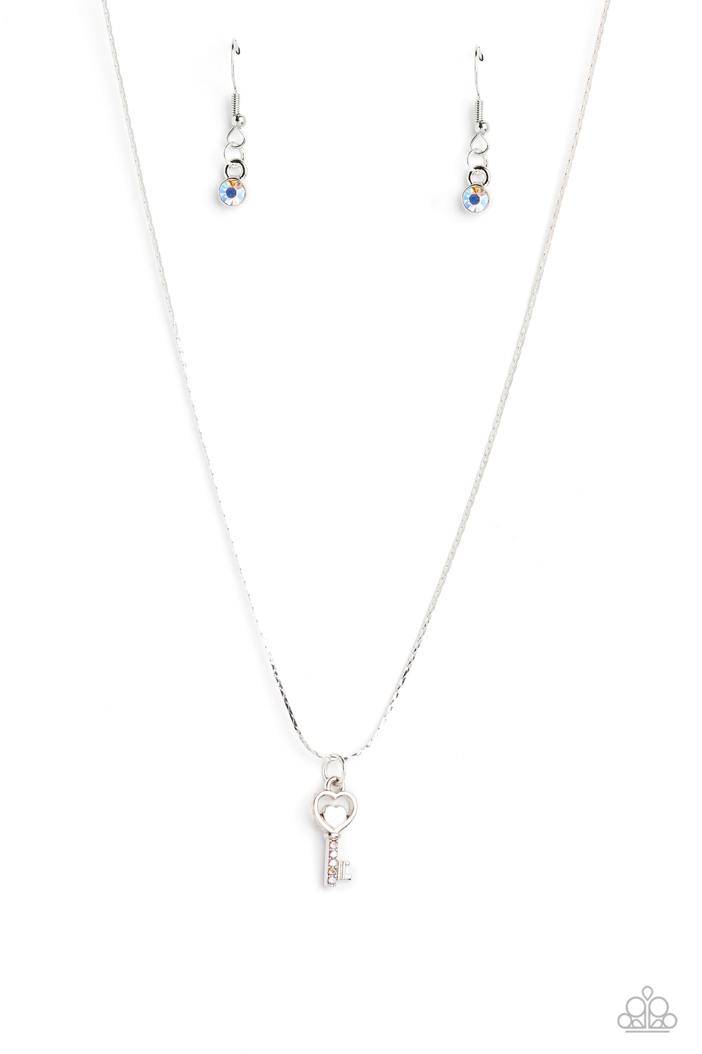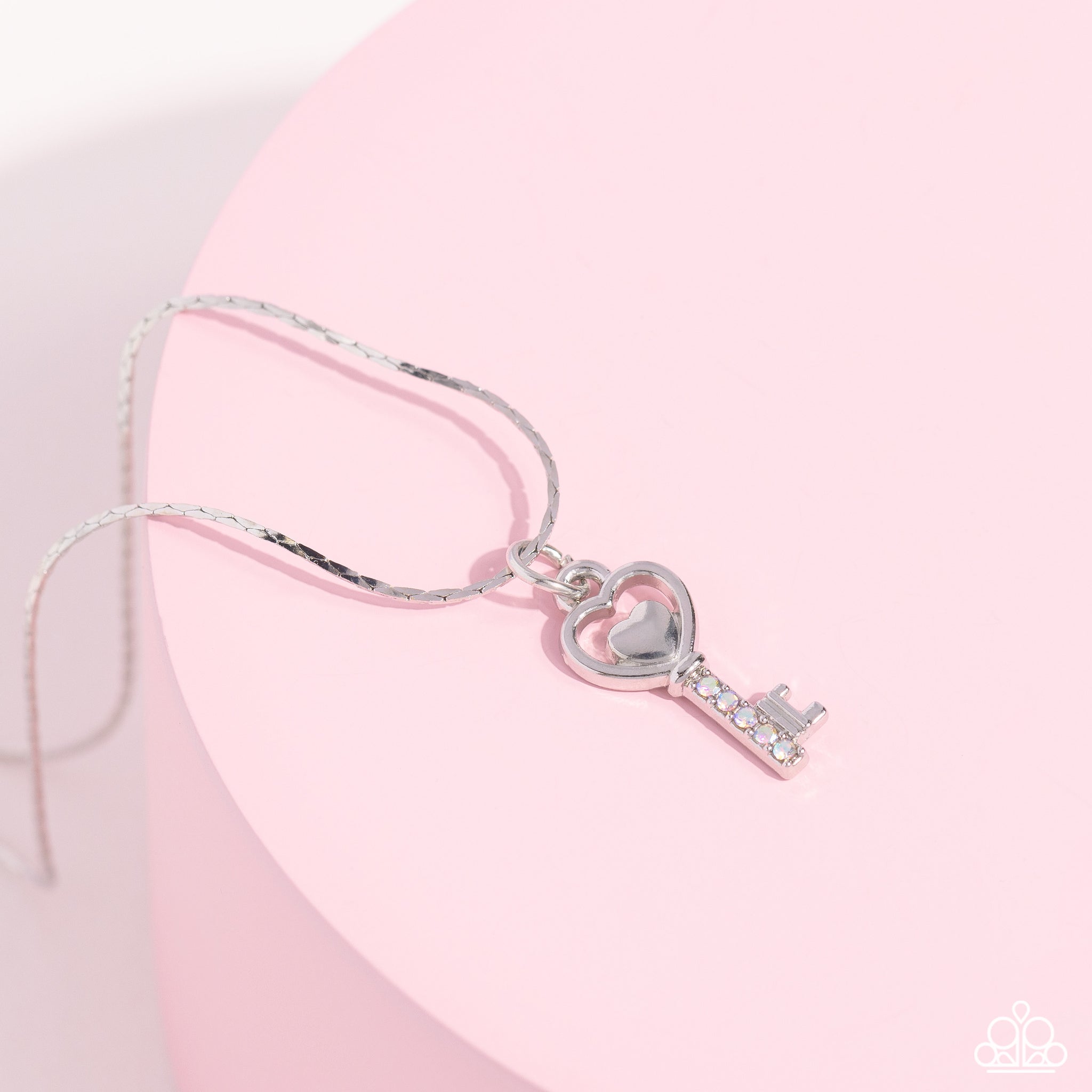 Dotted with glittery white rhinestones, a key pendant with a heart outline swings from the bottom of a dainty silver chain for a whimsical look. Features an adjustable clasp closure. Due to its prismatic palette, color may vary.