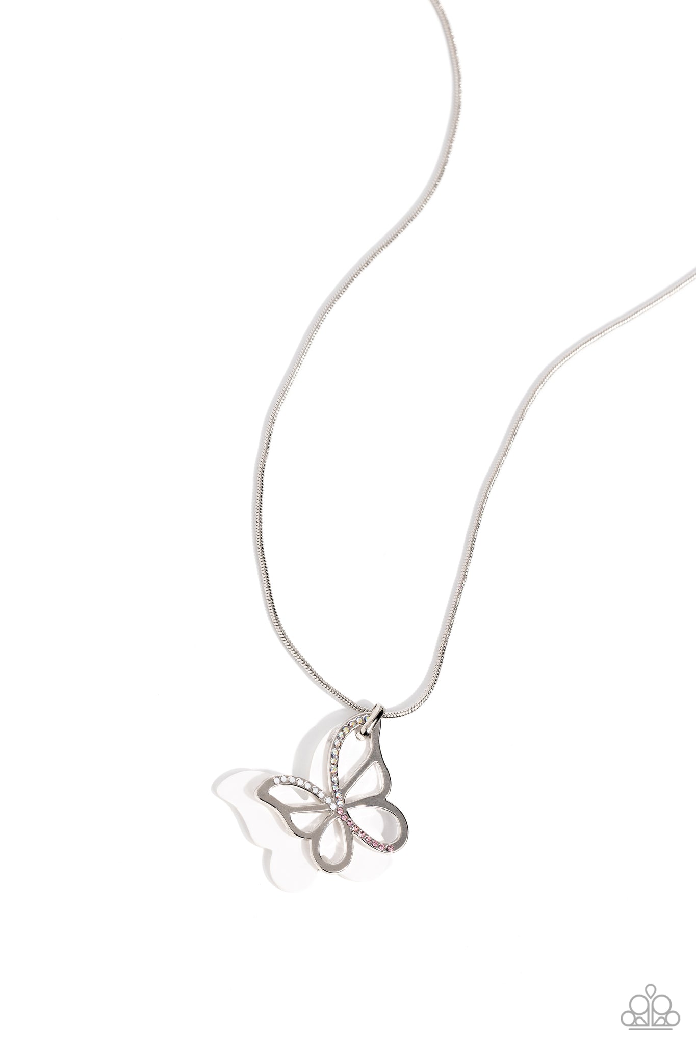Layered beside a silver butterfly silhouette dotted with pink, iridescent, and opalescent rhinestones, a white-painted acrylic butterfly flutters from a silver snake chain below the collar for a whimsical fashion. Features an adjustable clasp closure. Due to its prismatic palette, color may vary.