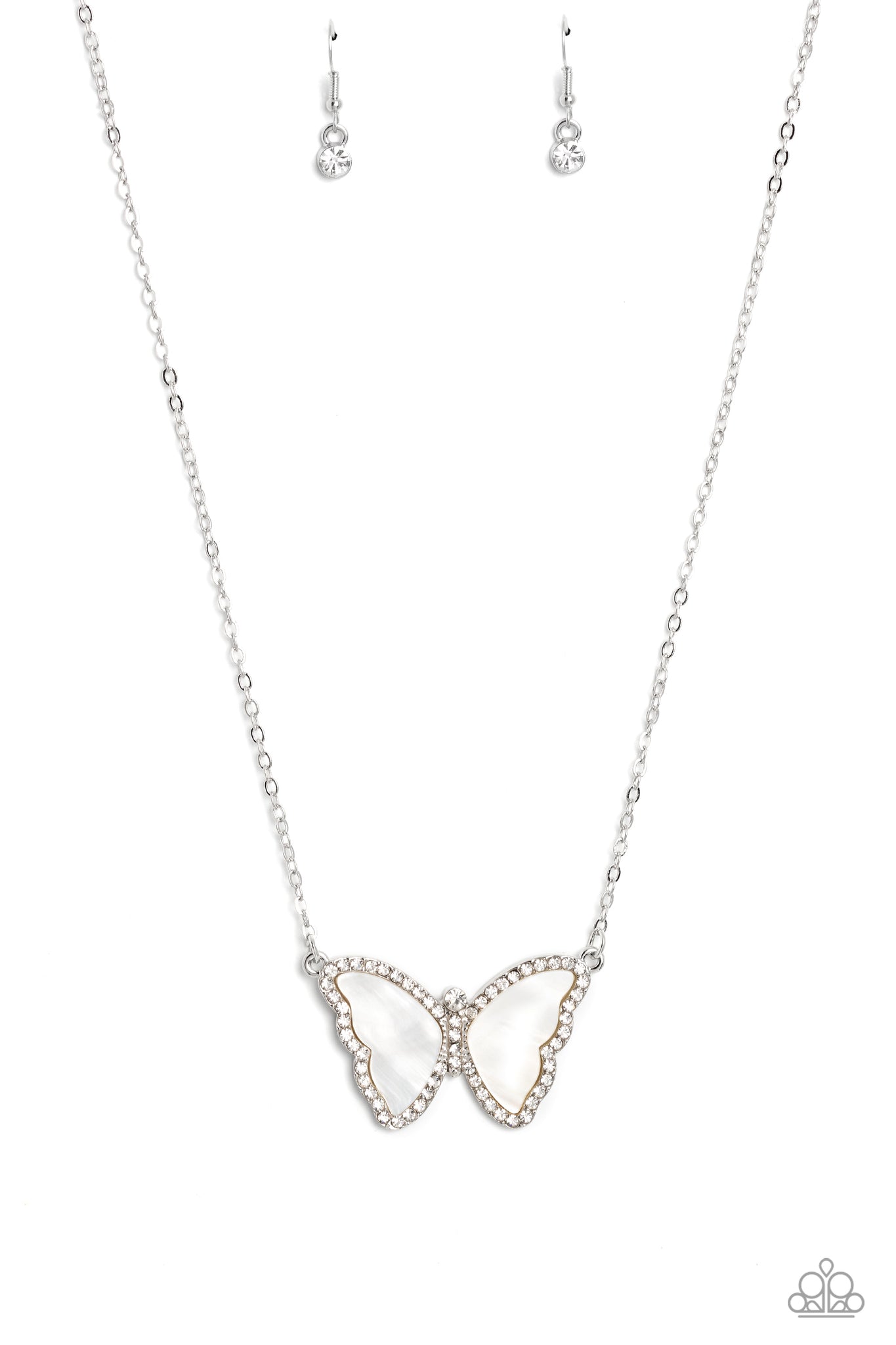 Shimmery white shells are encased inside a silver butterfly frame, creating its wings. Bordering the shell wings and encrusted along the butterfly's body, are white rhinestones that shimmer and shine at the bottom of a shiny, elongated chain, creating a whimsical pendant. Features an adjustable clasp closure.
