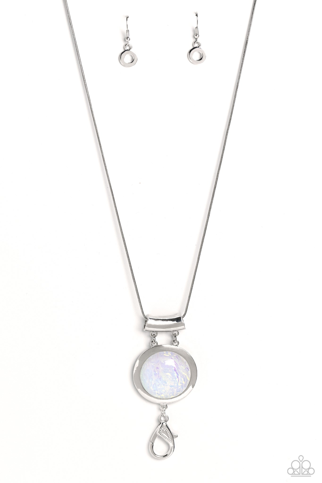 Featuring a refracted shimmer and an opalescent finish, an oversized, glassy white gem falls along the chest on an elongated silver snake chain to create a hypnotic pop of color. The exaggerated sparkle is pressed into a silver circular frame with a bowing silver frame, bringing a touch of metallic grit to the design. A lobster clasp hangs from the bottom of the design to allow a name badge or other item to be attached. Features an adjustable clasp closure. Due to its prismatic palette, color may vary.