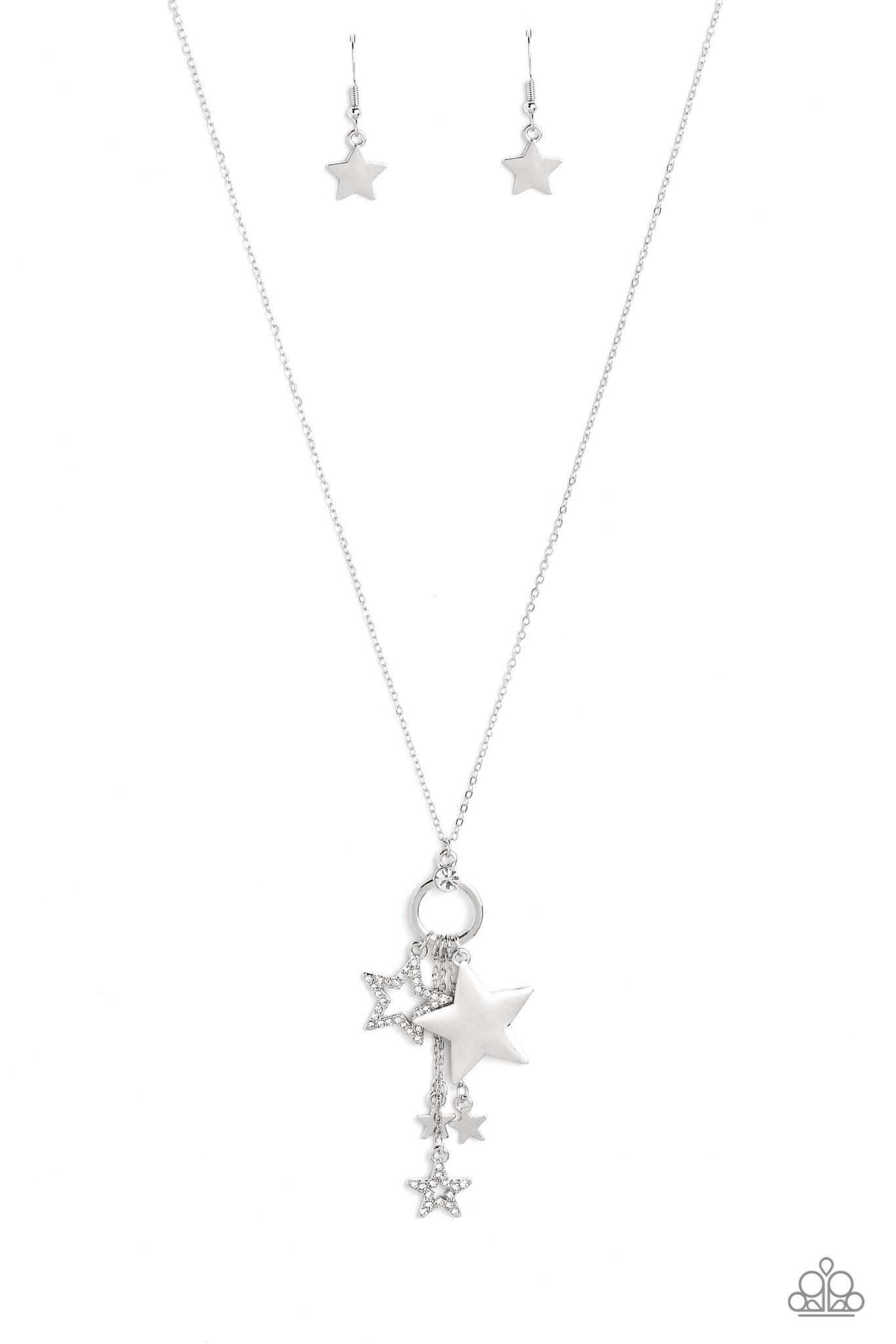 Hanging from an airy silver hoop, a collection of silver stars in varying sizes shimmer down the neck in this all-American piece. Airy, white rhinestone-studded stars mix with the other stars to add some extra shimmer. A dainty white rhinestone rests atop the silver ring for an additional pop of color. Features an adjustable clasp closure.