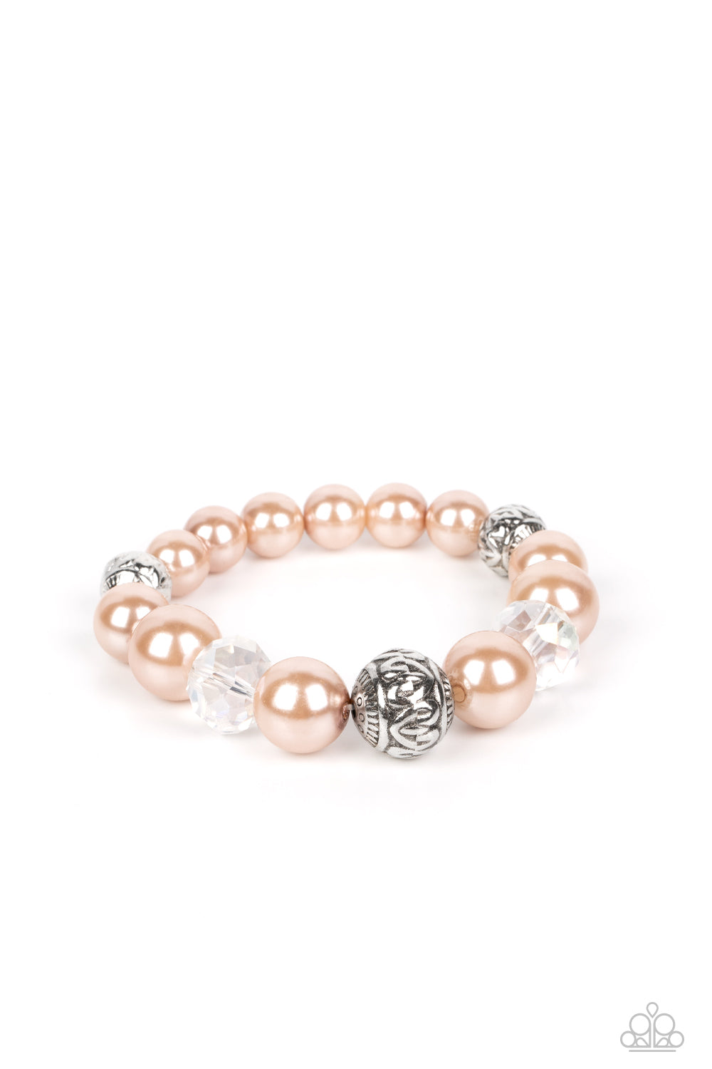 Bubbly Iced Coffee pearls, silver antique-detailed balls, and reflective beads nobly drape around the wrist on an elastic stretchy band for a refined pop of color.