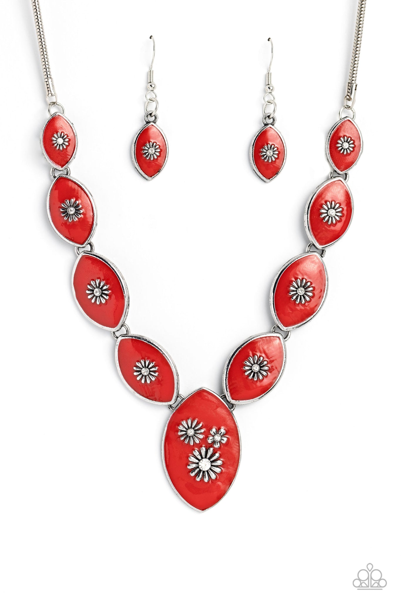 Featuring vibrant red paint, a collection of silver marquise-shaped frames gradually increase in size as they taper below the collar in a timeless fashion on a silver snake chain. Each frame is embossed with a delicate silver flower with a white rhinestone center, with the centermost pendant featuring three flowers, creating a glamorous array of whimsicality. Features an adjustable clasp closure.