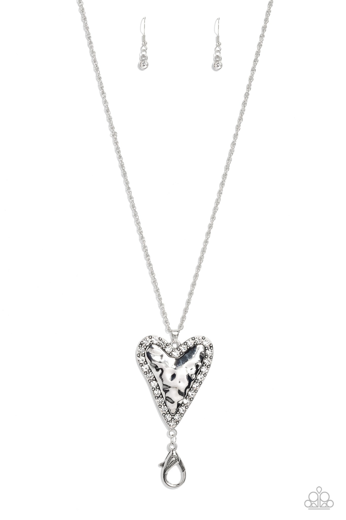 Hammered in antiqued texture, an oversized, abstract silver heart swings from the bottom of a silver chain for a whimsical look. Silver studs and glittery white gems border the hammered texture for a touch of bling. Features an adjustable clasp closure. A lobster clasp hangs from the bottom of the design to allow a name badge or other item to be attached. Features an adjustable clasp closure.