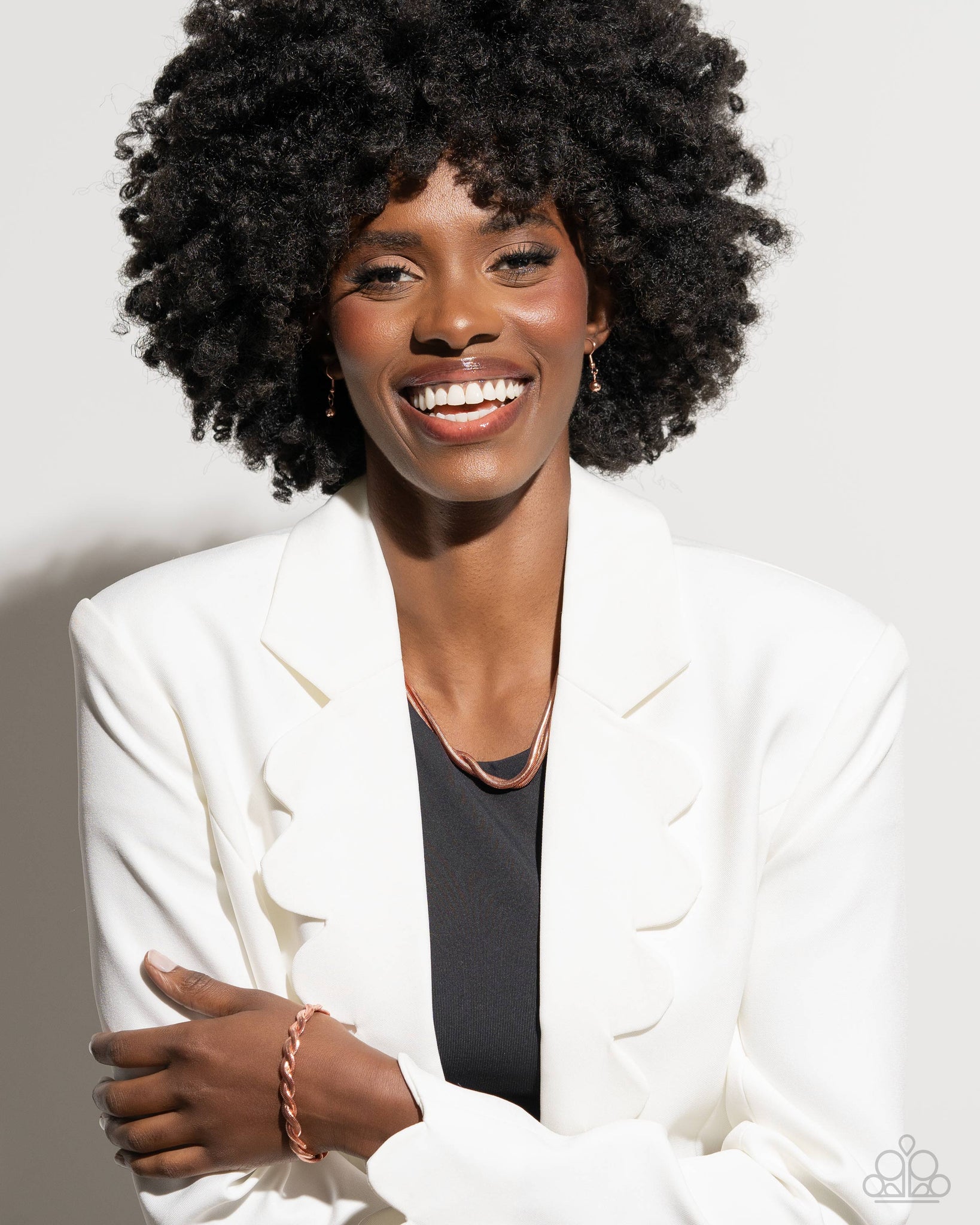 Two sleek strands of high-sheen shiny copper snake chains layer below the neckline, slightly merging through a delicate twist for a touch of visual interest. Features an adjustable clasp closure.