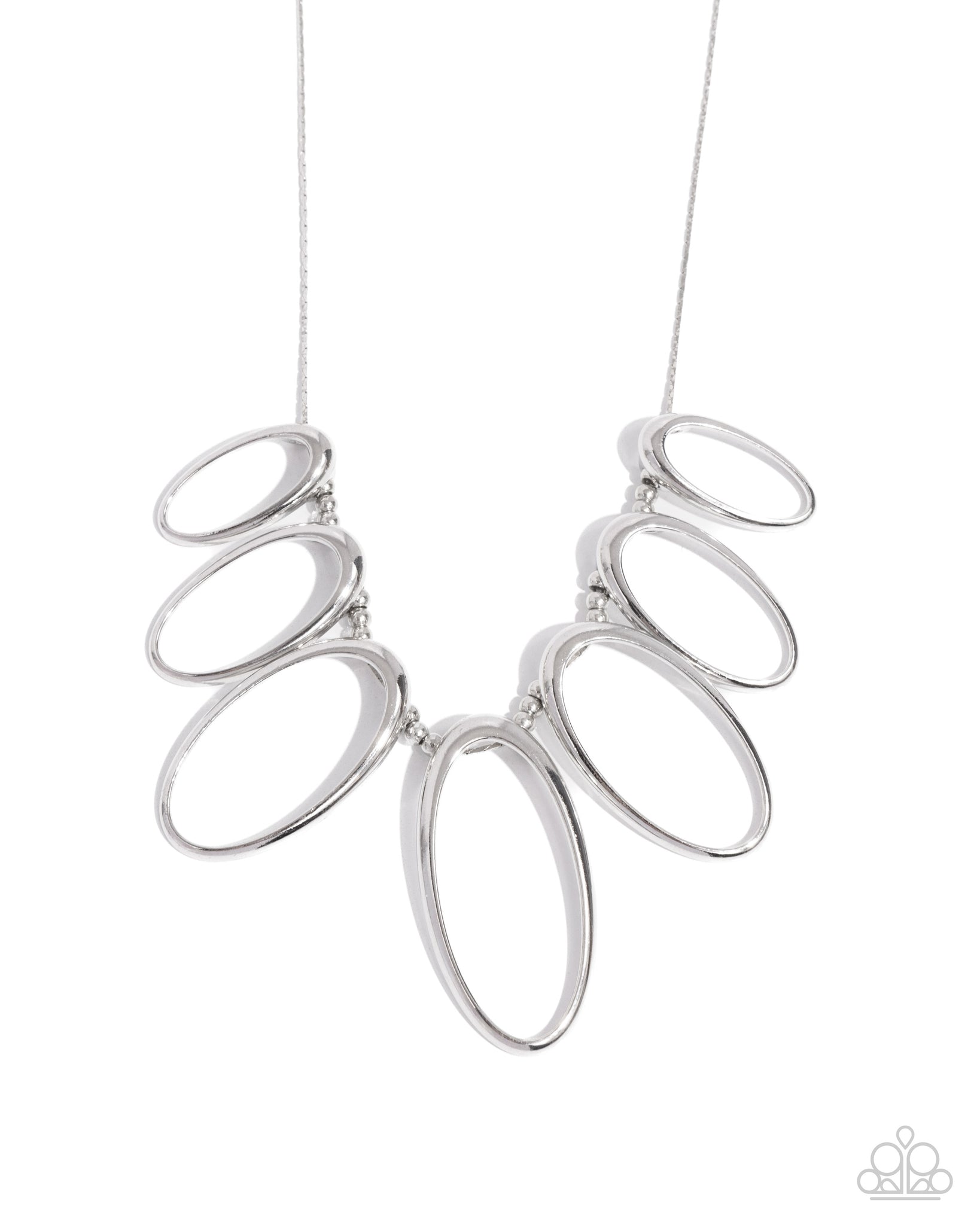 Separated by trios of dainty silver beads, shiny silver ovals gradually increase in size as they glide along a dainty flat silver chain below the collar, resulting in an airy fringe. Features an adjustable clasp closure.