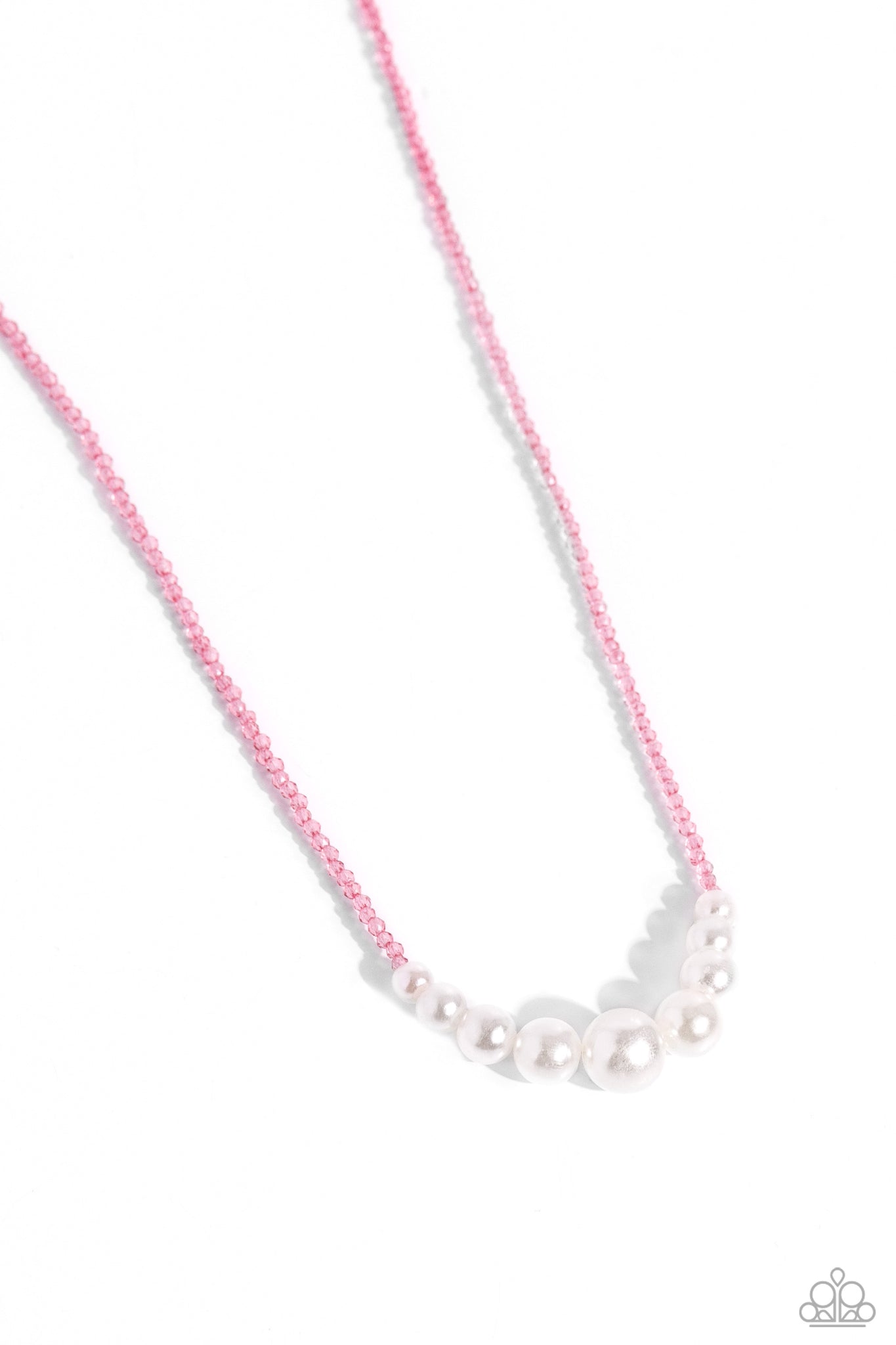 Gradually increasing in size near the center, glossy white pearls stand out against dainty, glistening, glassy pink beads that are threaded along an invisible wire below the collar for a refined finish. Features an adjustable clasp closure.