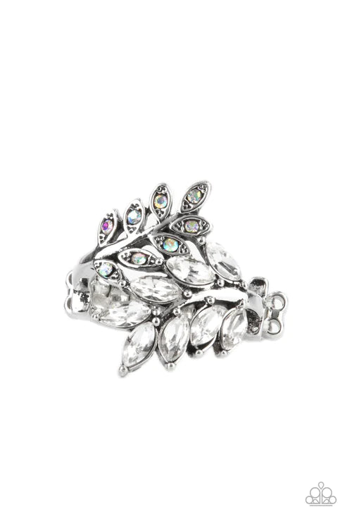 Encrusted in glassy white and iridescent rhinestones, two leafy silver bands delicately overlap across the finger for a sparkly seasonal look. Features a stretchy band for a flexible fit.