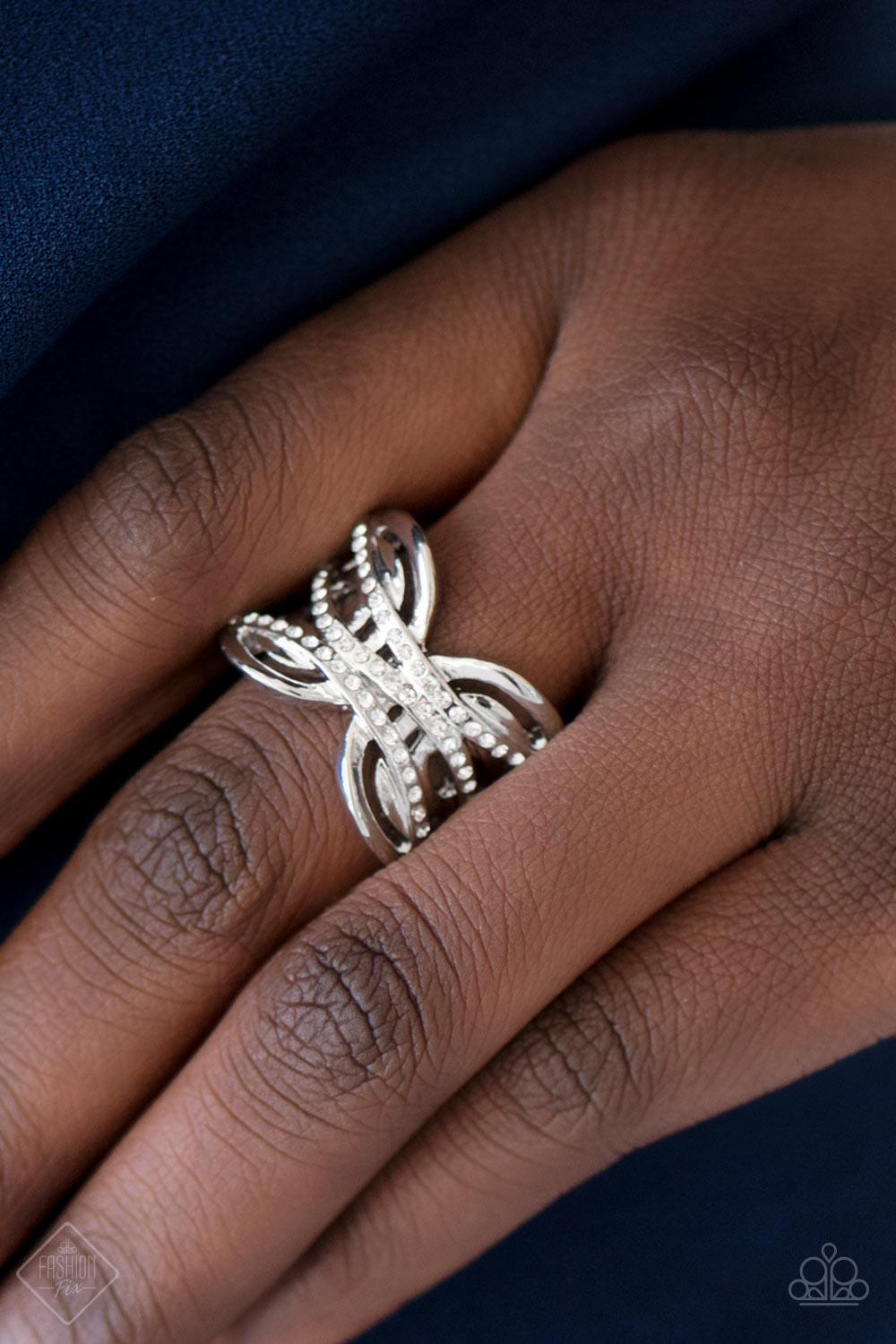 Glistening silver bars swoop across the finger, creating wings. Encrusted in glittery white rhinestones, glistening ribbons of silver wrap around the refined frame for a timeless finish. Features a stretchy band for a flexible fit.
