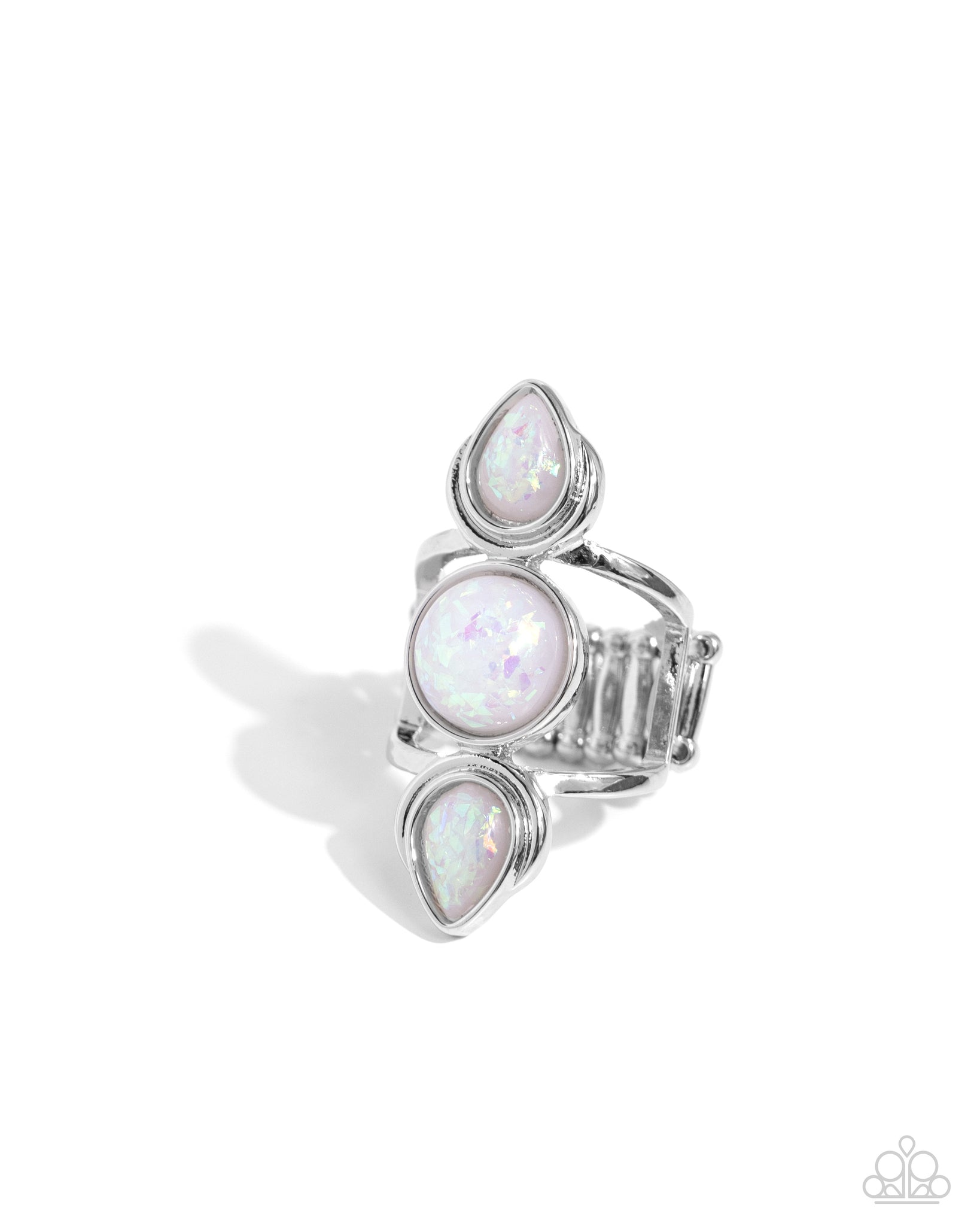 Featuring an opalescent finish, three refreshing white round and teardrop beads flecked with shimmering glitter stack into a whimsical statement piece atop an airy silver frame. Features a stretchy band for a flexible fit.