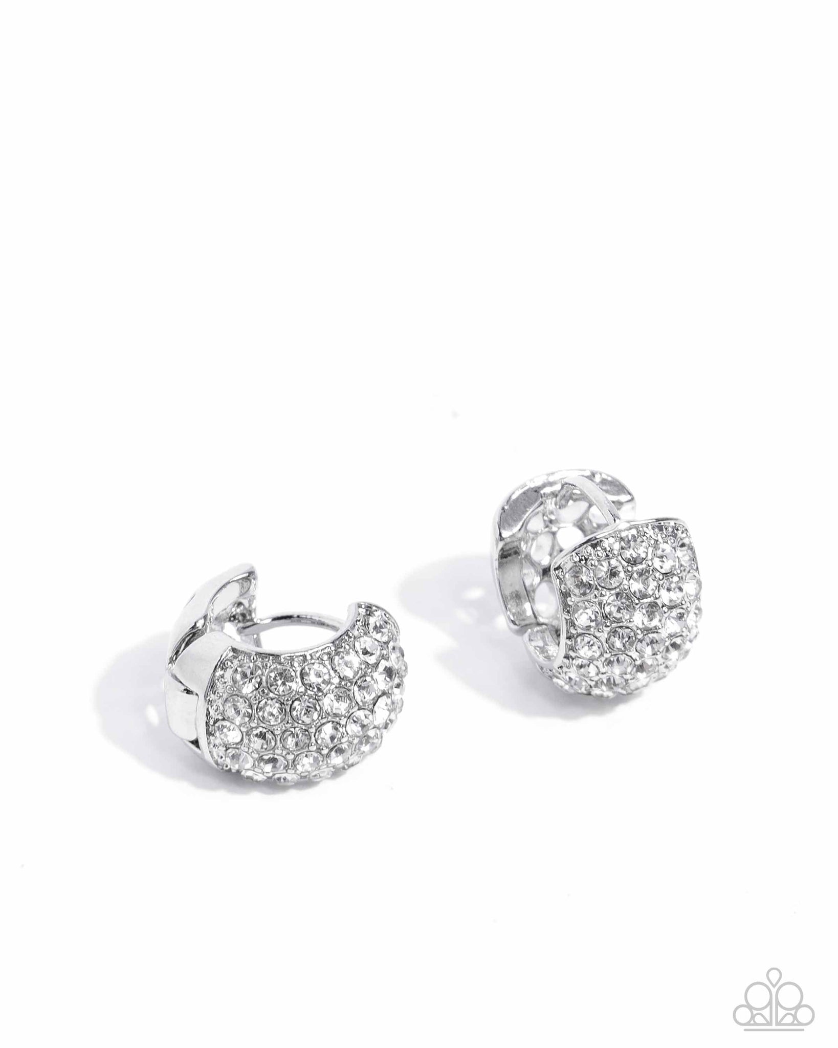 Embellished in row after row of white rhinestones, a thick silver hoop hugs along the ear for an upscale, unique look. Earring attaches to a standard hinge closure fitting. Hoop measures approximately 3/4" in diameter.