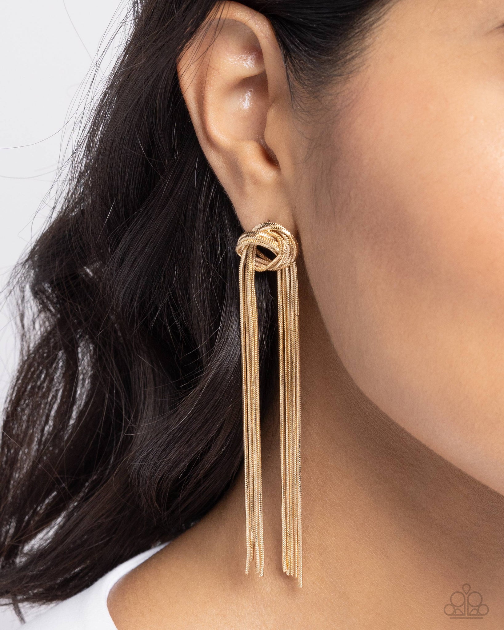 Flat gold snake chains stream from a knotted wreath made from the same material, creating a dramatic shoulder-dusting fringe. Earring attaches to a standard post fitting.
