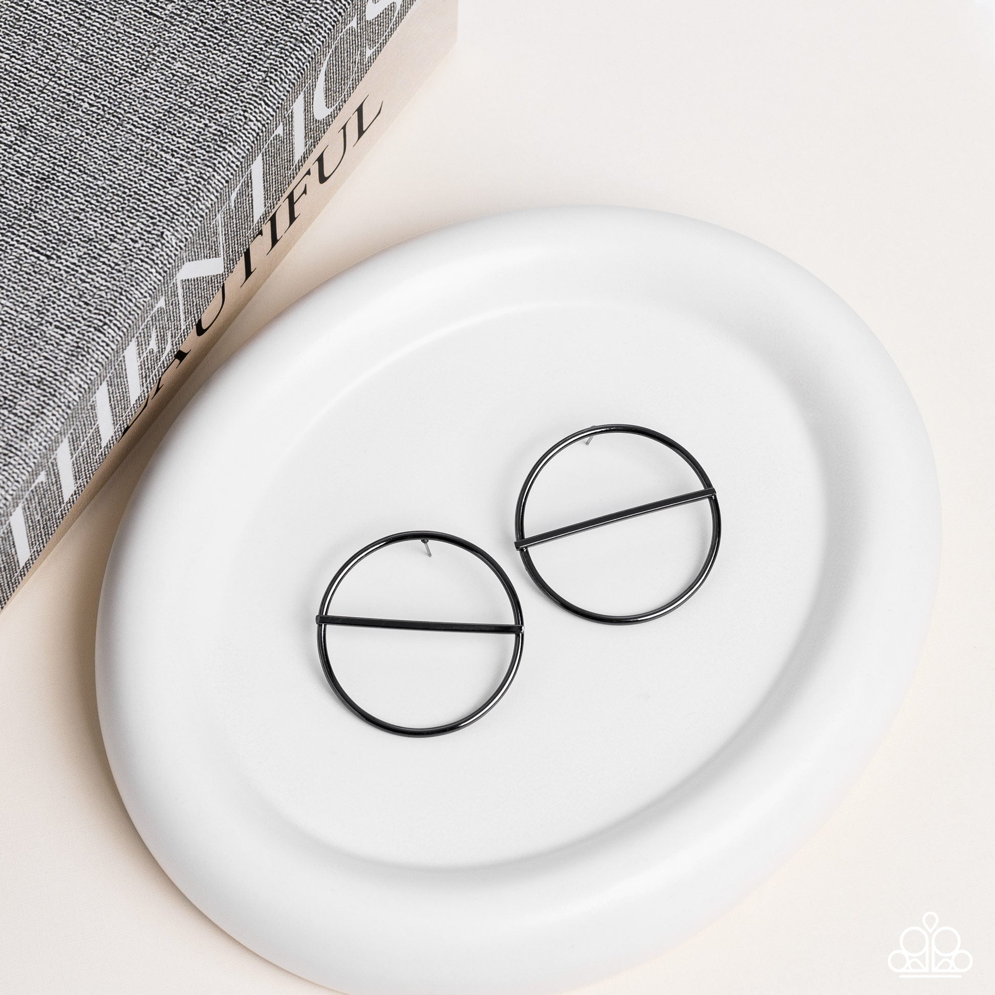 A glistening gunmetal bar runs horizontally across the center of an oversized gunmetal hoop, adding a timeless twist to the classic display. Earring attaches to a standard post fitting.
