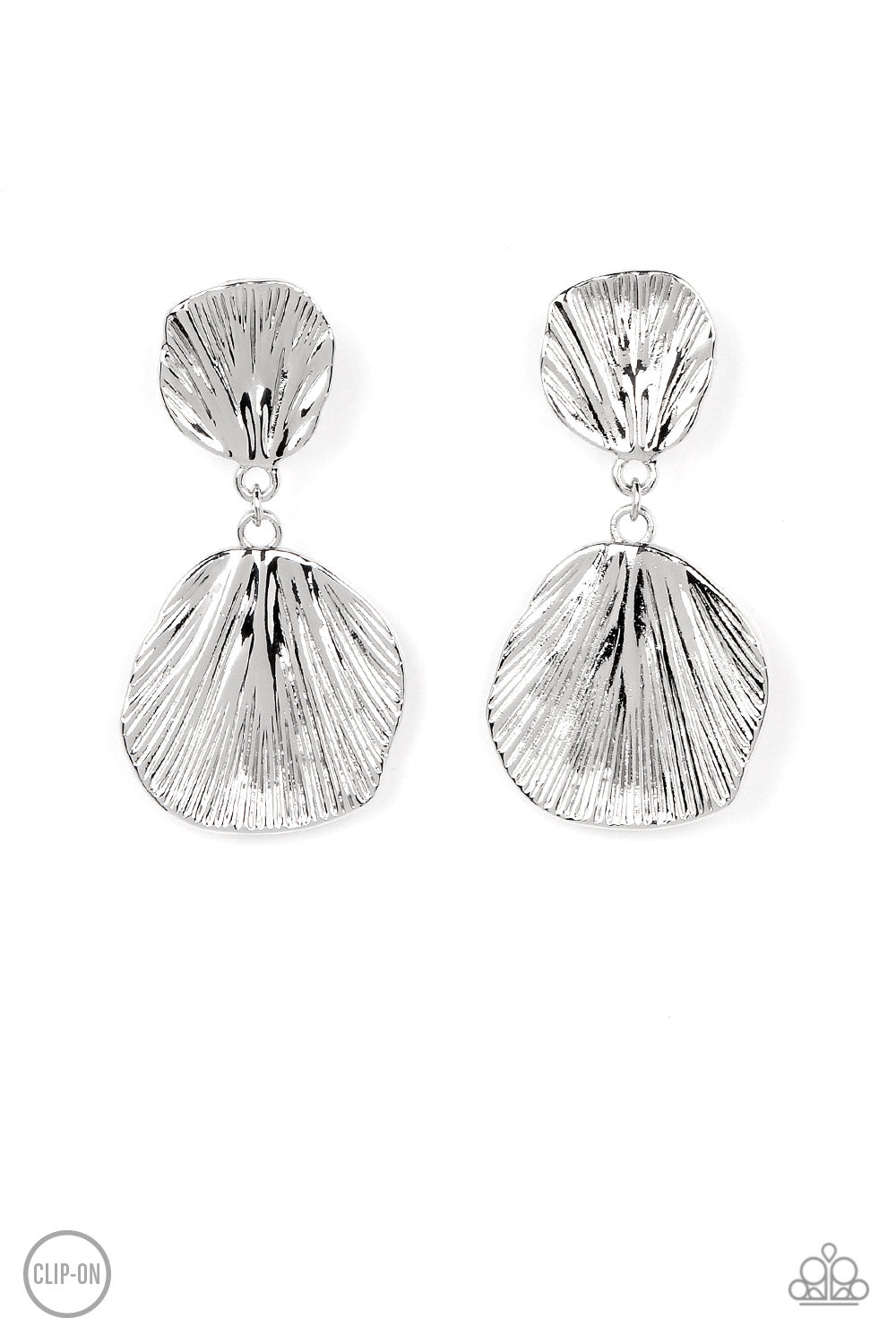 Embossed and rippling with lifelike details, a pair of silver shells delicately links into an asymmetrical lure for a modern twist. Earring attaches to a standard clip-on fitting.