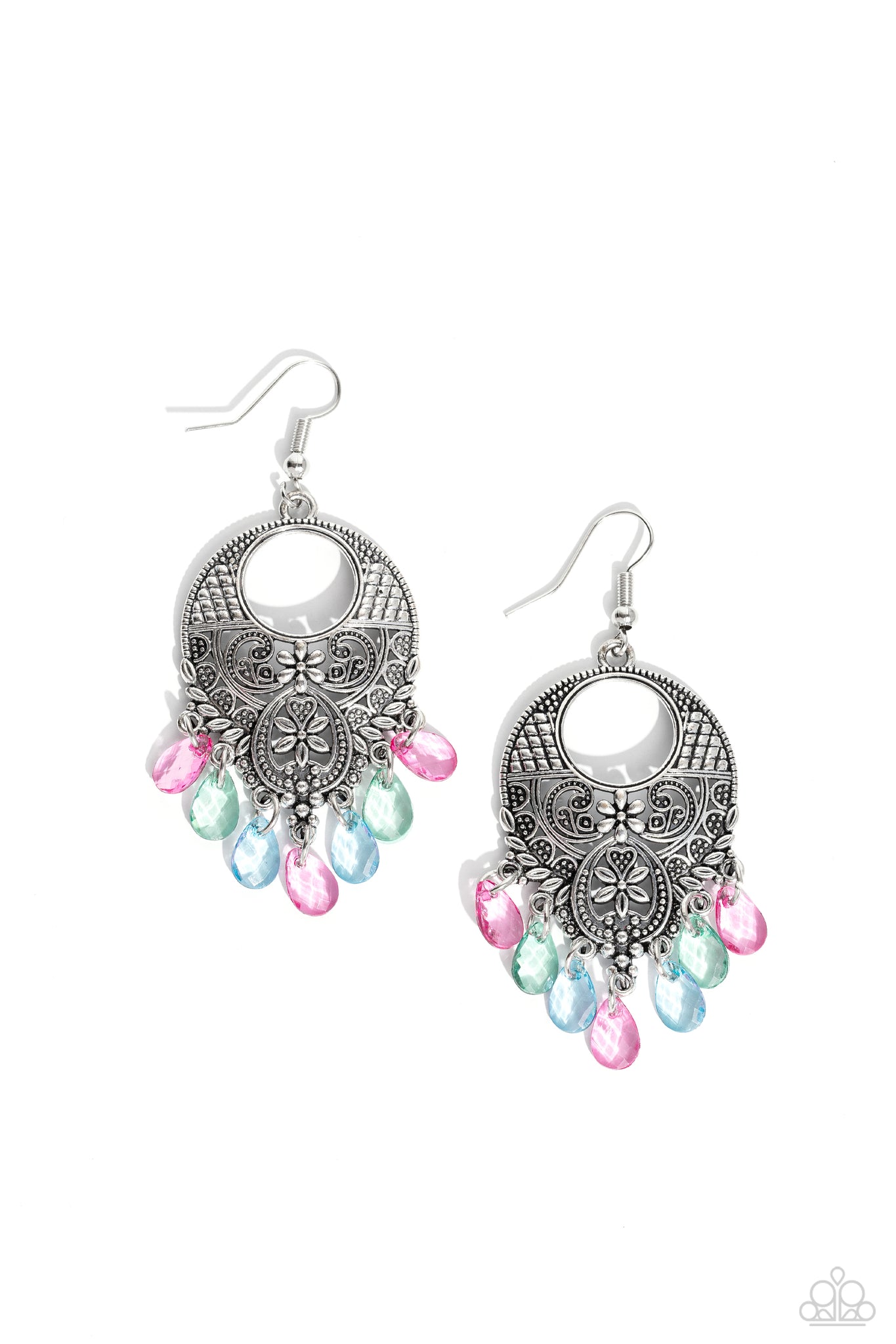 Glassy blue, green, and pink teardrops cascade from the bottom of an ornately stacked floral frame radiating in studded textures, resulting in an enchanting chandelier. Earring attaches to a standard fishhook fitting.