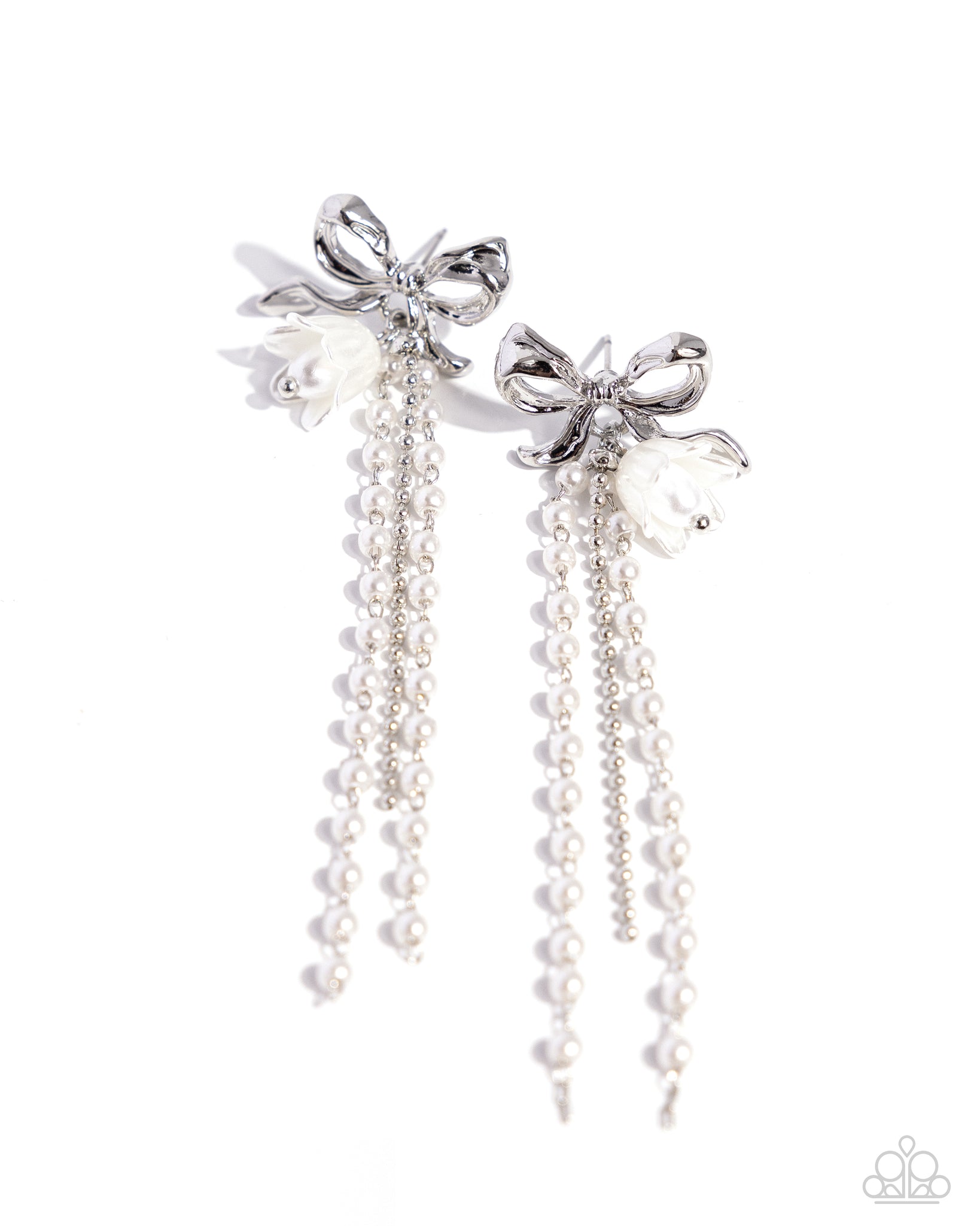 A high-sheen silver bow gives way to a collection of dainty white pearls, a strand of silver ball chain, and a pearlized tulip for an enchanting, elegant array. Earring attaches to a standard post fitting.