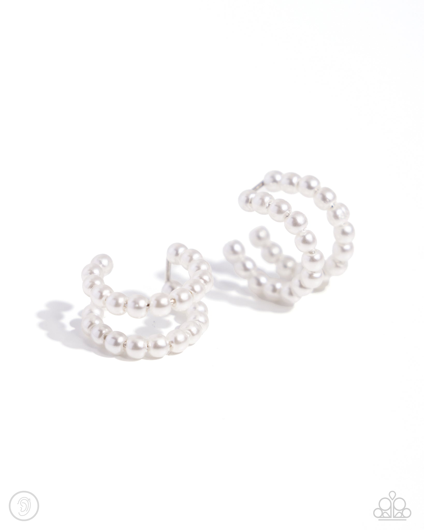 Infused along an invisible wire, a double-layered display of glossy white pearls curls around the ear creating an adjustable, one-size-fits-all refined cuff.