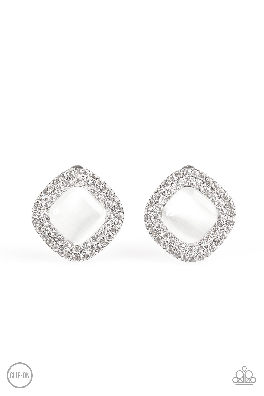 A dewy white moonstone is pressed into a white rhinestone encrusted frame for a glamorous look. Earring attaches to a standard clip-on fitting.