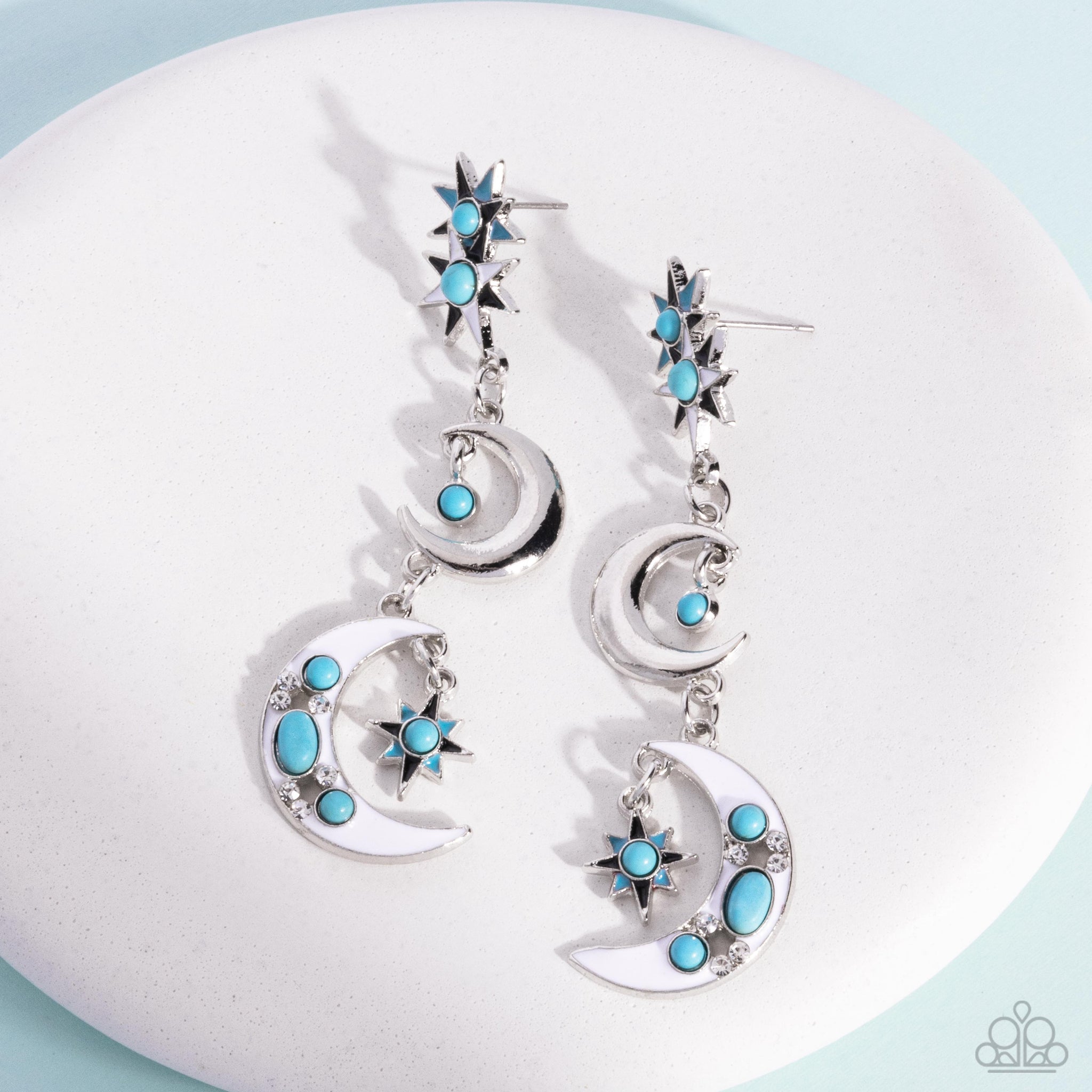 Mismatched silver celestial charms including three-dimensional stars and crescent moons embellished with black and blue paint, round and oval turquoise stones, and white rhinestones cascade below the ear in a three-tiered display, switching in direction and suspended silver fittings for an eclectic extraterrestrial look. Earring attaches to a standard post fitting. As the stone elements in this piece are natural, some color variation is normal.
