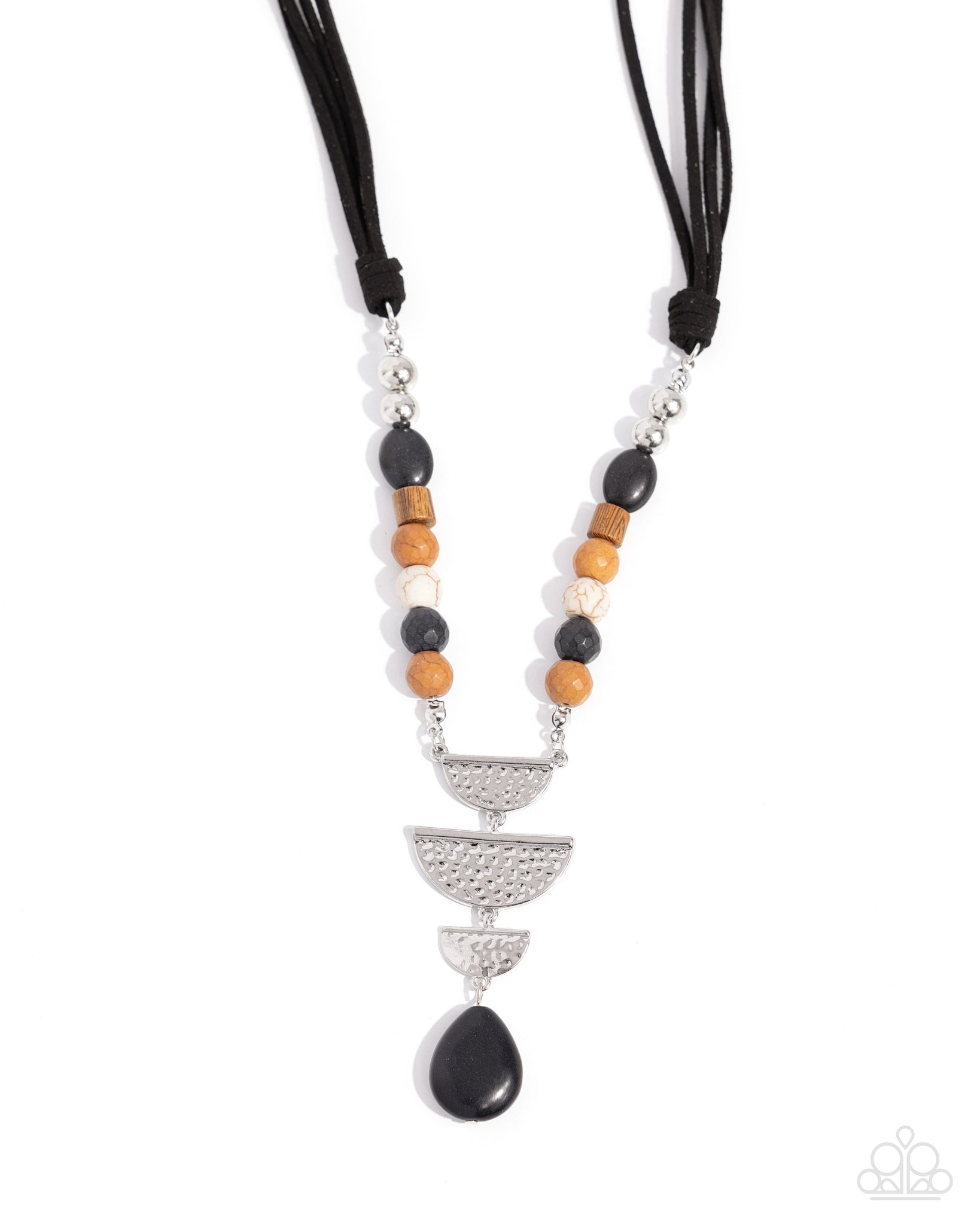 Infused along the neckline below strands of knotted black suede, a collection of silver beads, oval and round black stones, white stones, round brown stones, and wooden beads give way to mismatched hammered, half-circle silver pendants which then gives way to an oversized black stone teardrop for an elegantly earthy look. Features an adjustable clasp closure. As the stone elements in this piece are natural, some color variation is normal.
