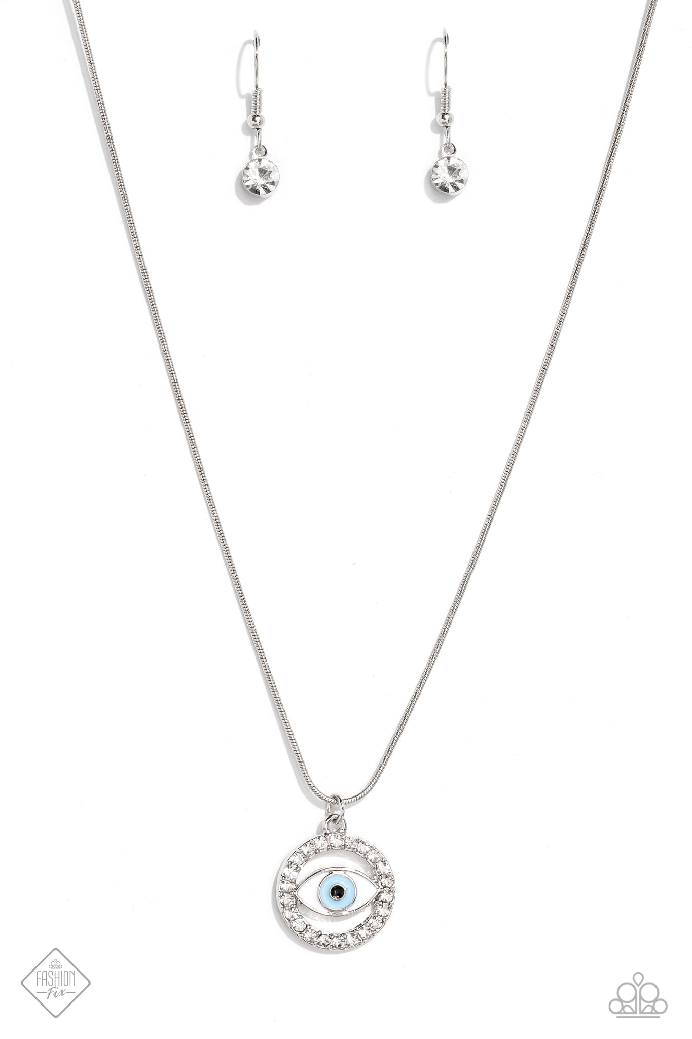 A light blue eye pendant is accented by silver edging and then wrapped in a circular border of brilliant white rhinestones. The sparkling charm slides effortlessly along a dainty snake chain, adding eye-catching movement to the design. Features an adjustable clasp closure.